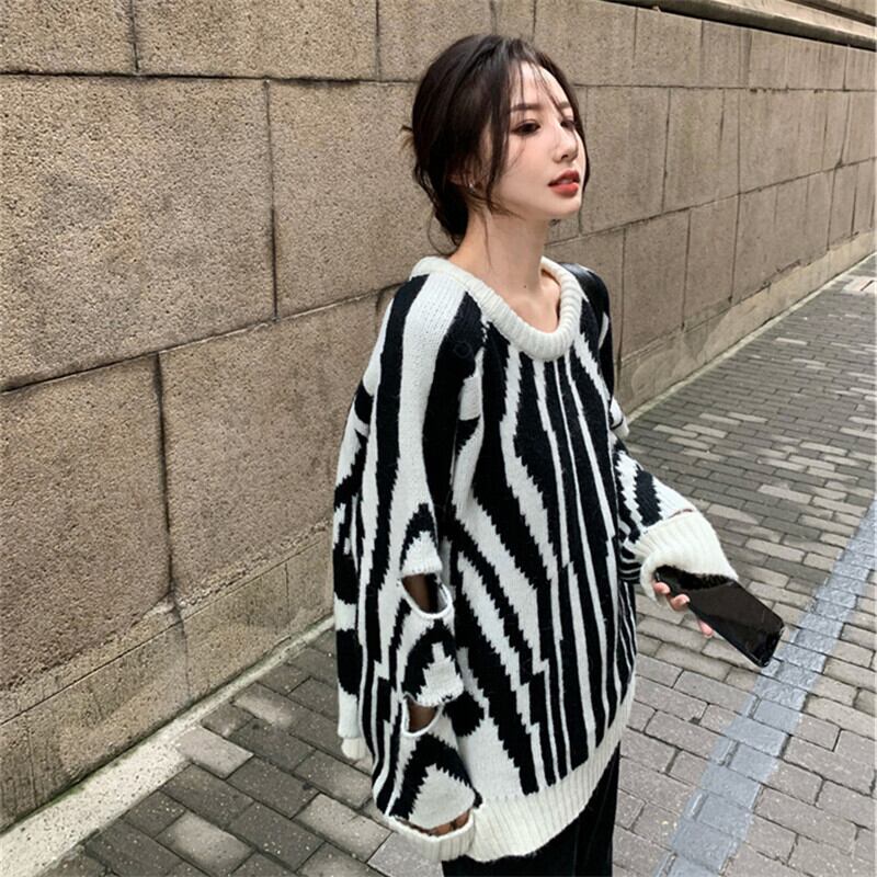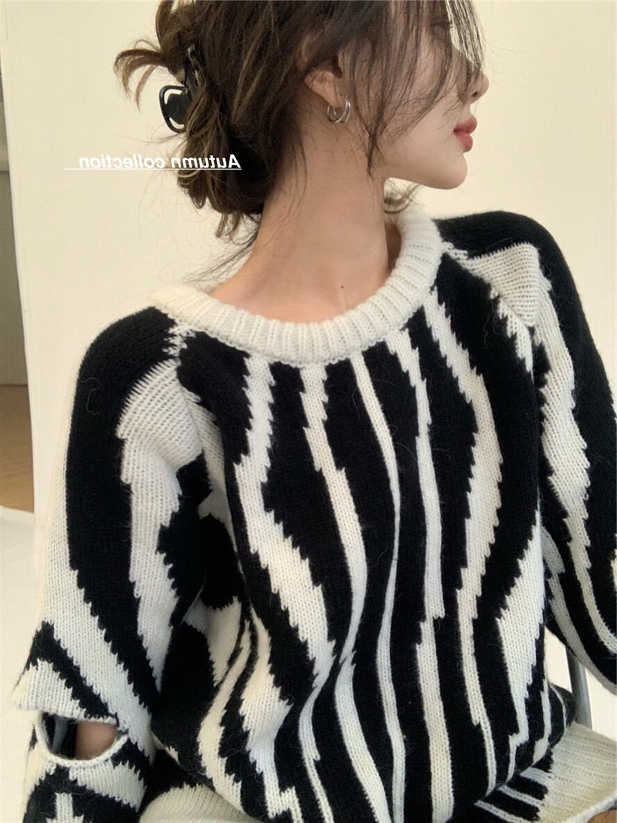 ストライプセーター ダメージスリーブ セーター ニット 長袖 ラウンドネック ルーズ 秋冬 レトロ a3322