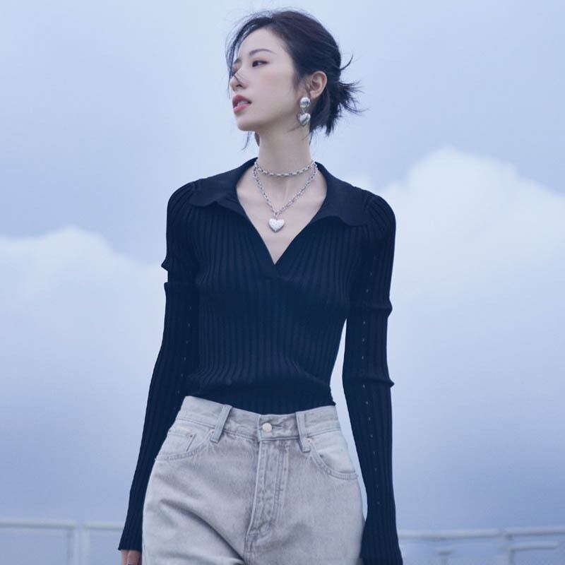Vネック リブニット ニット セーター. トップス ポロシャツ 薄手 レディース a3343
