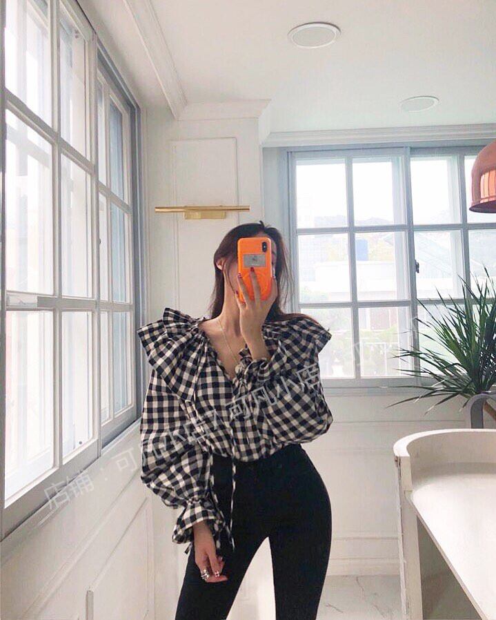 チェック柄 フリルブラウス シャツ ブラウス レディース ランタンスリーブ フリル トップス トランペットスリーブ 韓国 春 夏 秋 a3354