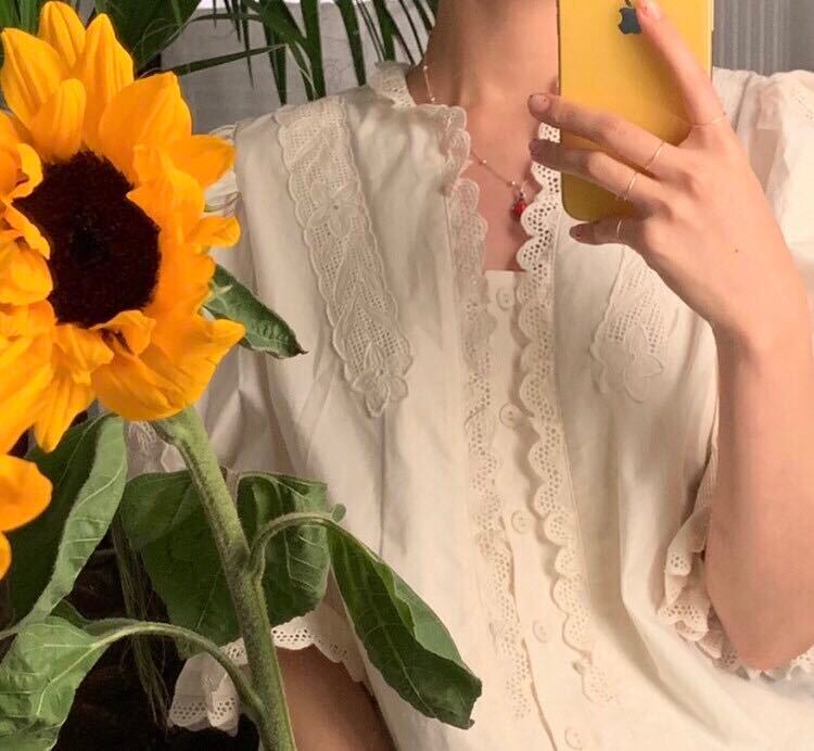 フレンチレース刺繡ブラウス ブラウス パフスリーブ シャツ レトロ 韓国 Vネック. a3365