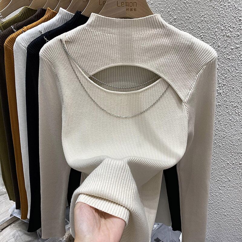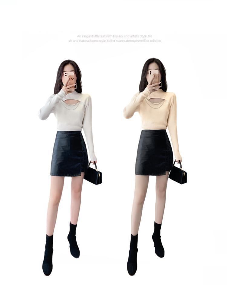 【チェーン付き】胸元スリットハーフハイネックセーター 長袖 ボトミングトップス リブニット セーター ニット 秋冬 韓国 6カラー a3367
