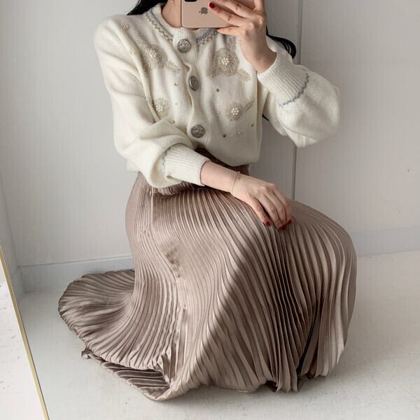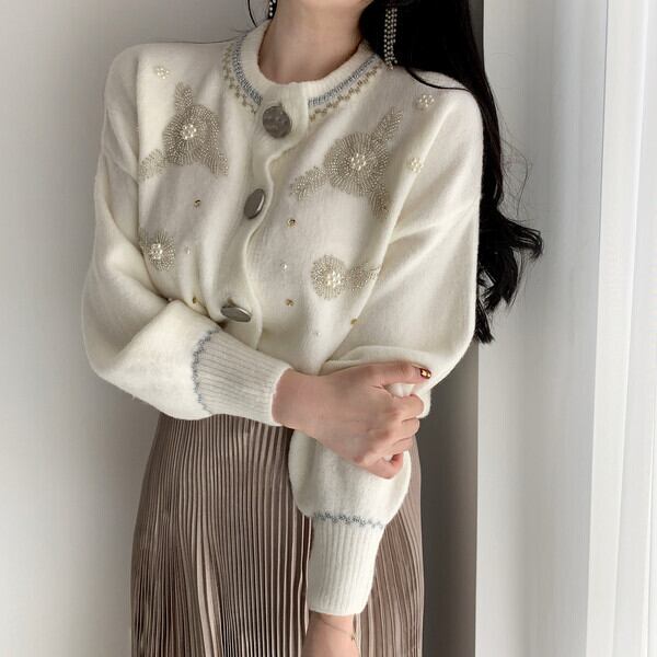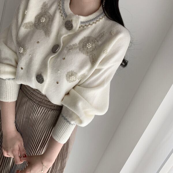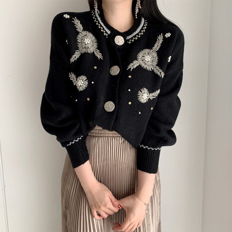 花刺繍ビーズニットカーディガン ニット カーディガン. ラウンドネック シングルブレスト 韓国. シック レトロ. a3411