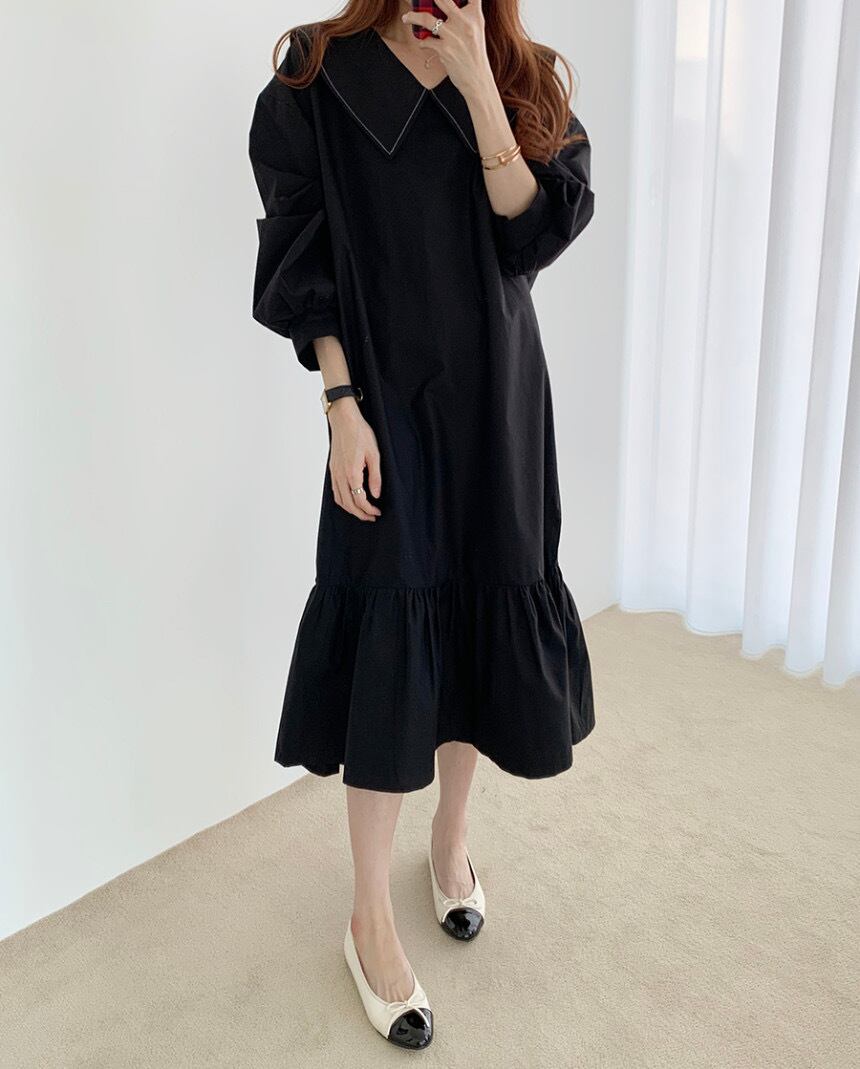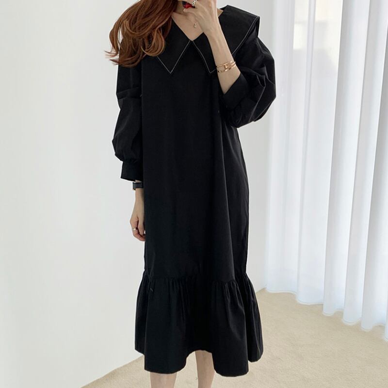 ビックカラー フレアワンピース 長袖ワンピース ワンピース ランタンスリーブ ルーズ 韓国 レトロ 2カラー a3417