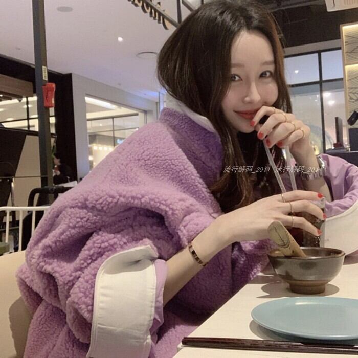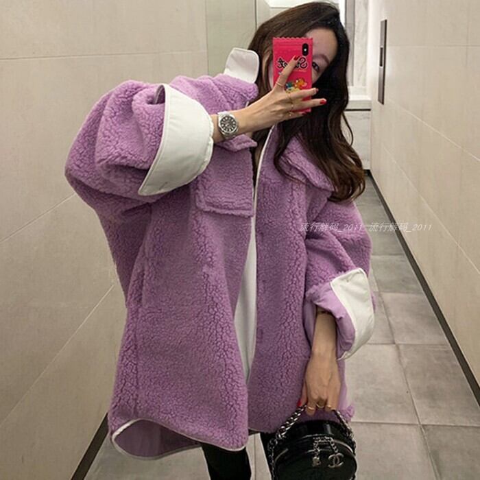 パープルラムウールコート コントラストカラー スリーブ襟 ラムウールコート もこもこ ジャケット コート アウター. 冬 韓国. a3512