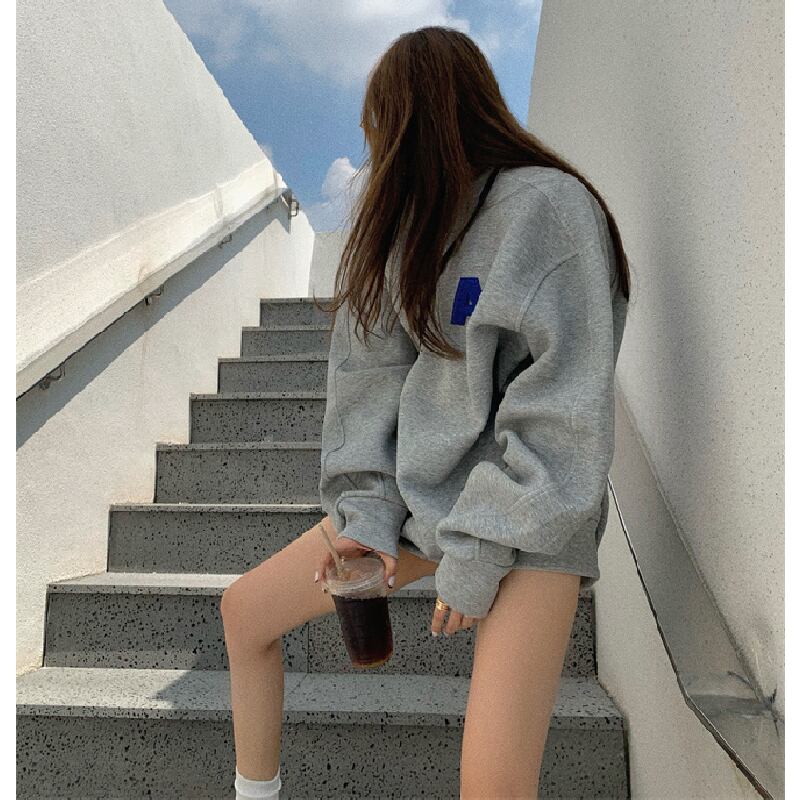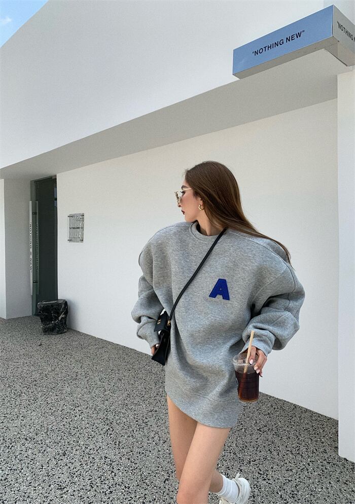 プルオーバートレーナー セーター オーバサイズ トップス 長袖.グレー ラウンドネック ルーズ ミドル丈 厚手 a3514