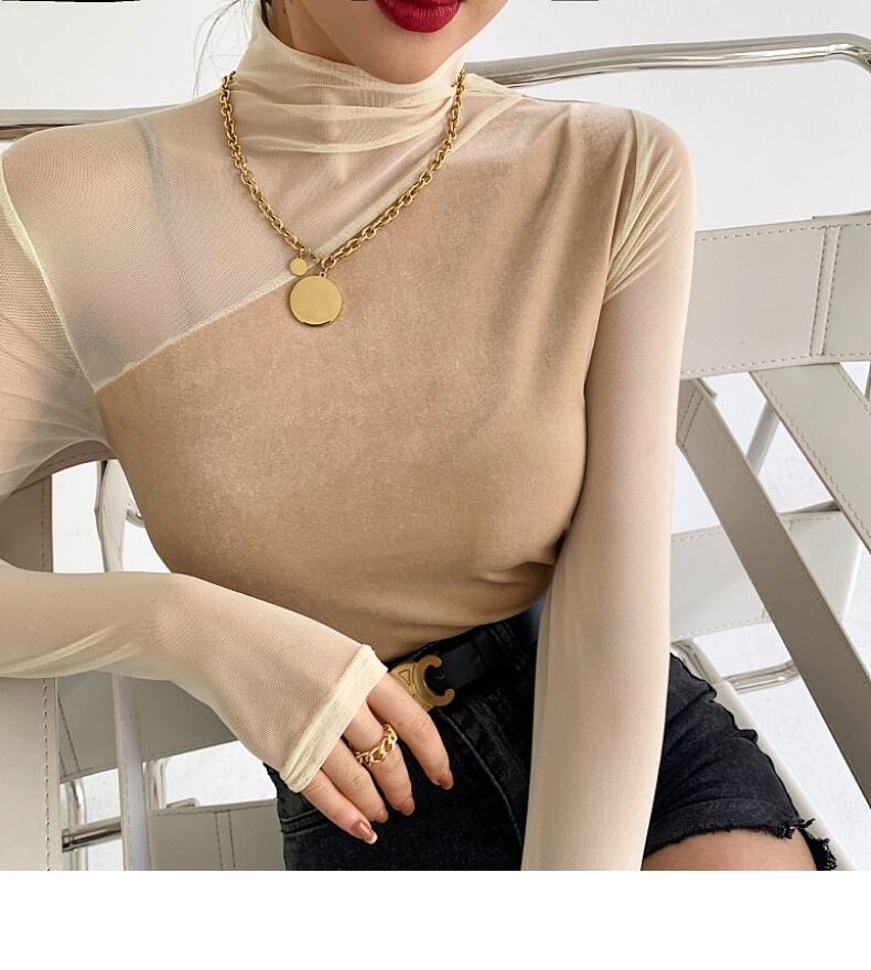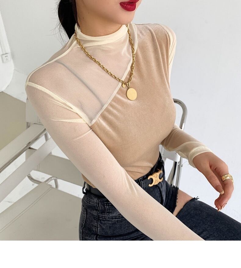 ボトミングシャツ 長袖Tシャツ. ベルベット メッシュ トップス ハーフハイカラー レース 3カラー a3439