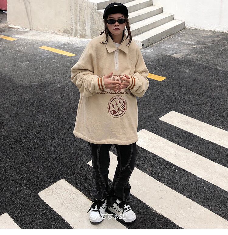 ポロカラー刺繡フリース ベルベット 厚い ポロシャツ. ルーズ セーター ストリート LAコーデ アメリカン a3579