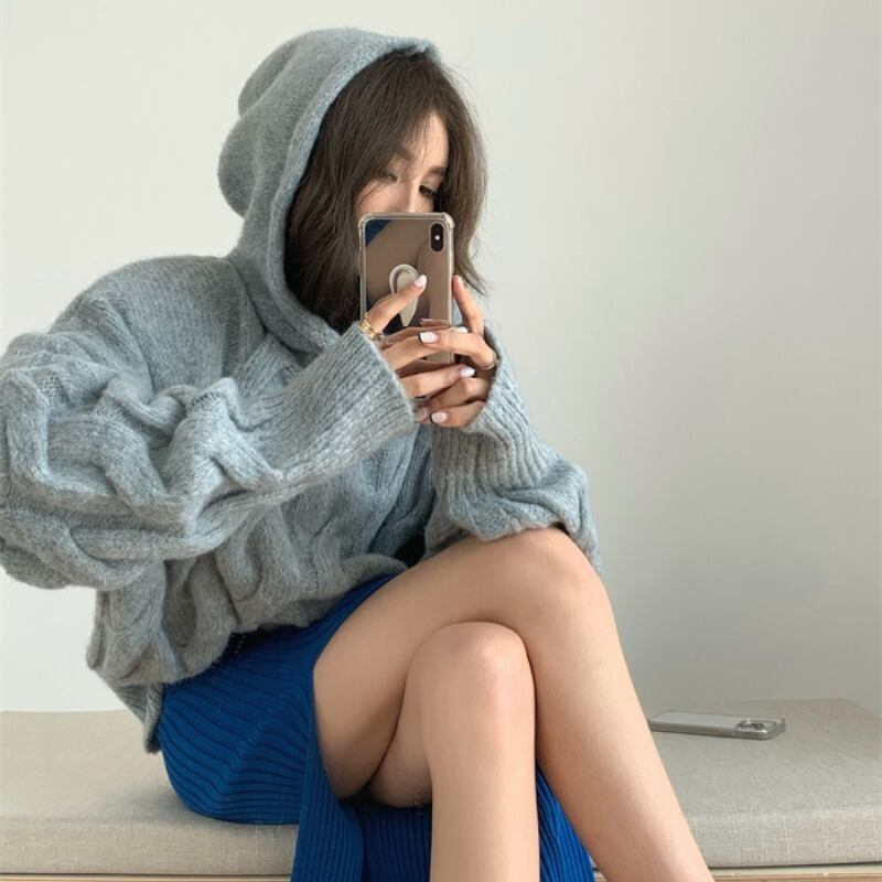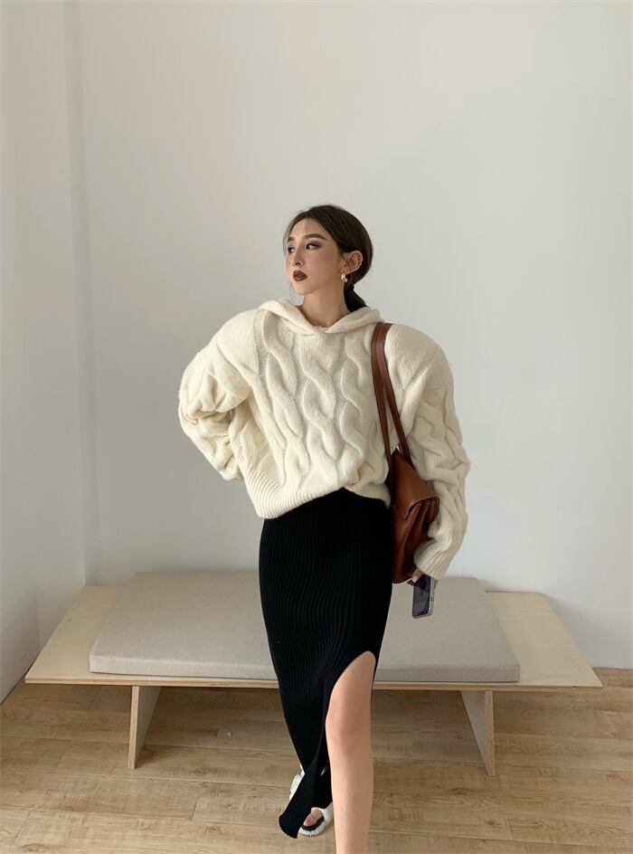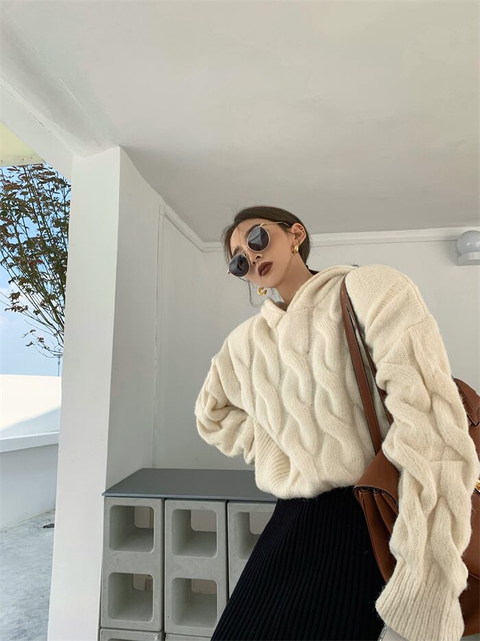 フード付き ツイストニットセーター ツイスト ニット セーター フーディー ルーズ 秋冬 レトロ 2カラー a3609