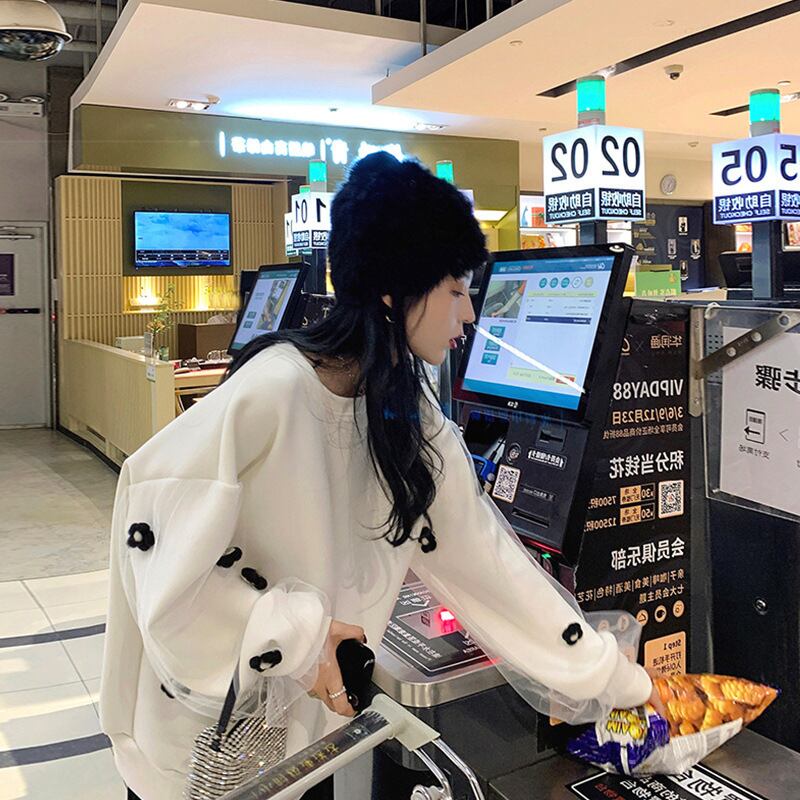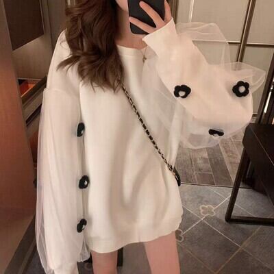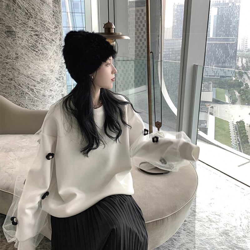 プルオーバーセーター フェアリースリーブ セーター ニット 長袖 トップス 立体フラワー ホワイトセーター. ラウンドネック ミドル丈 a3630