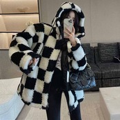チェッカーボード柄 フード付き ラムウールジャケット