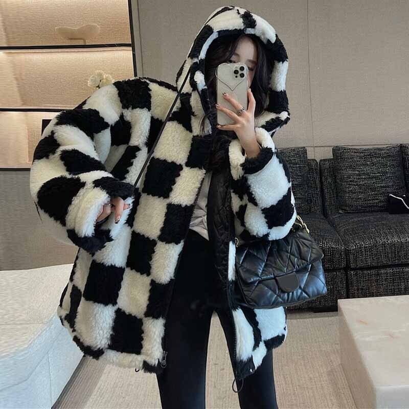 チェッカーボード柄 フード付き ラムウールジャケット ベルベット コート ジャケット アウター フリース レディース 秋冬 厚手 a3616