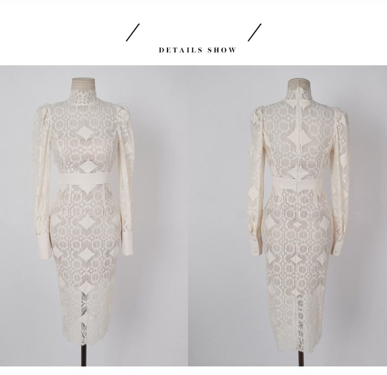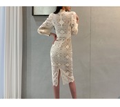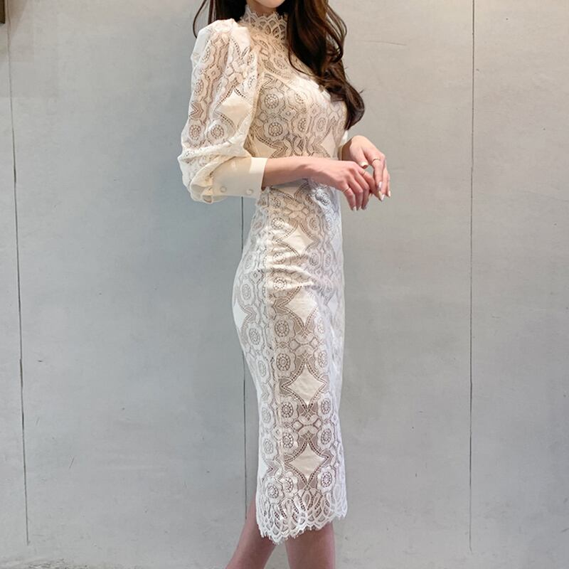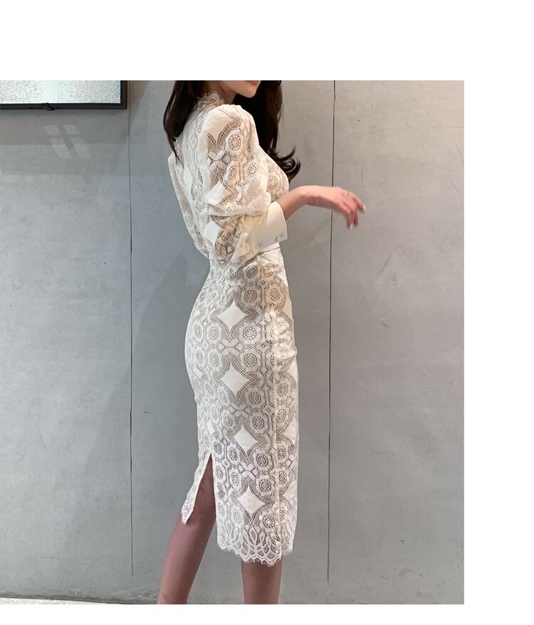 ホローレースドレス レース ドレス ワンピース スリット ハイネック ランタンスリーブ レディース ミドル丈. スリム セクシー エレガント キャバ嬢 パーティー a3660