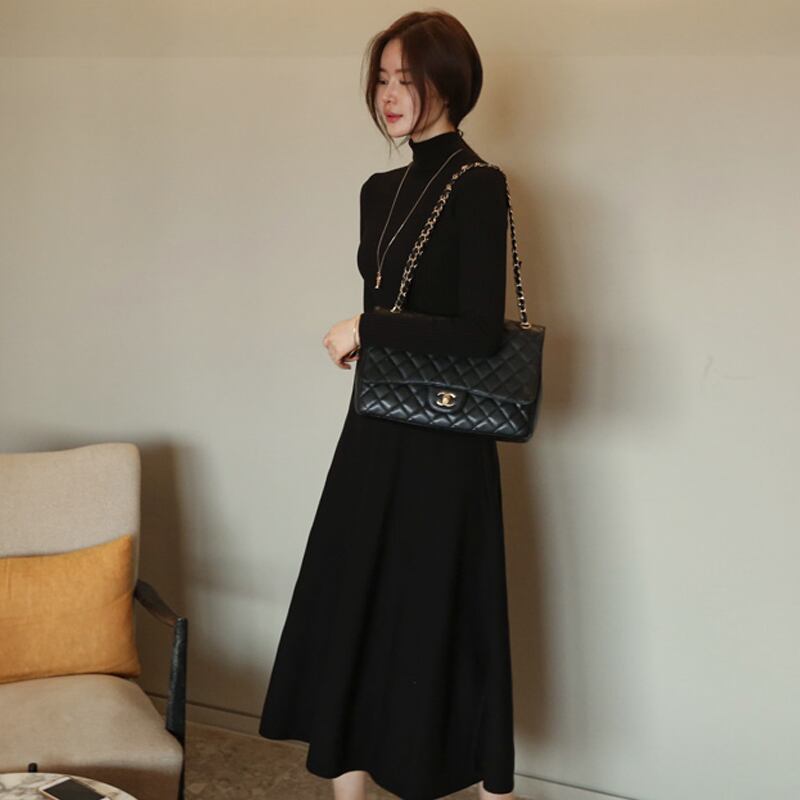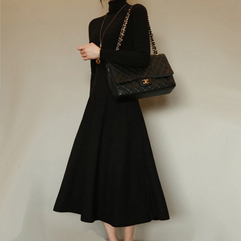タートルネックニットワンピース ニットワンピース ニット セーター ドレス ワンピース ハイネック セータースカート 黒 秋冬 2カラー a3677