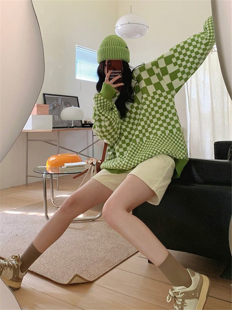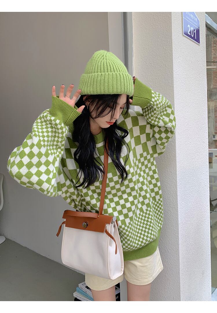 チェッカーボード プルオーバーセーター ニット セーター ラウンドネック ルーズ 韓国 シック 秋冬 2カラー a4070
