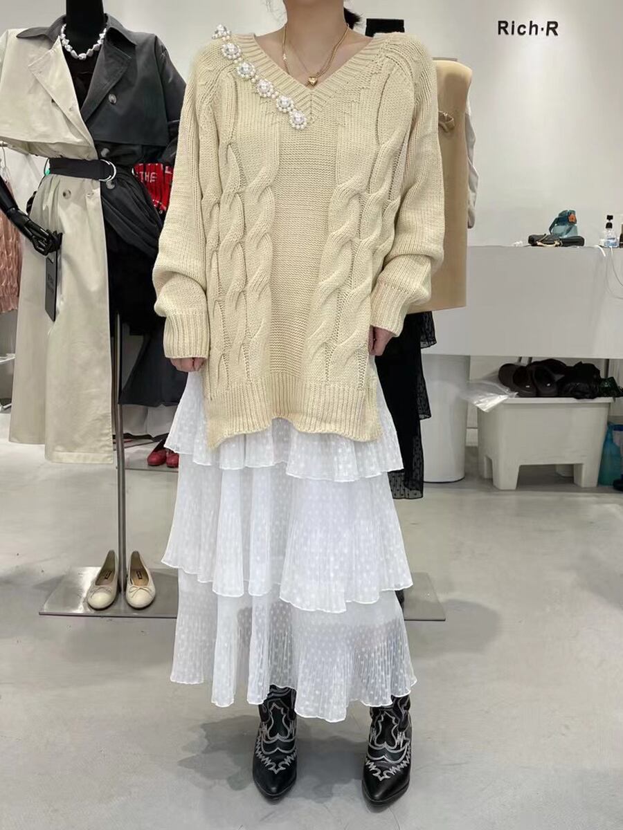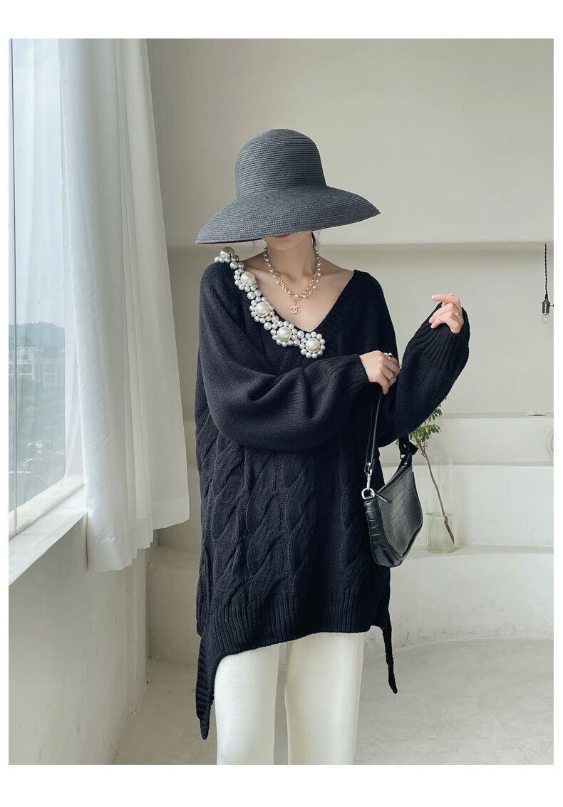Vネックパールセーター プルオーバー ニット レディース セーター 秋冬 ルーズ フレンチ ケーブルニット 4カラー a3704