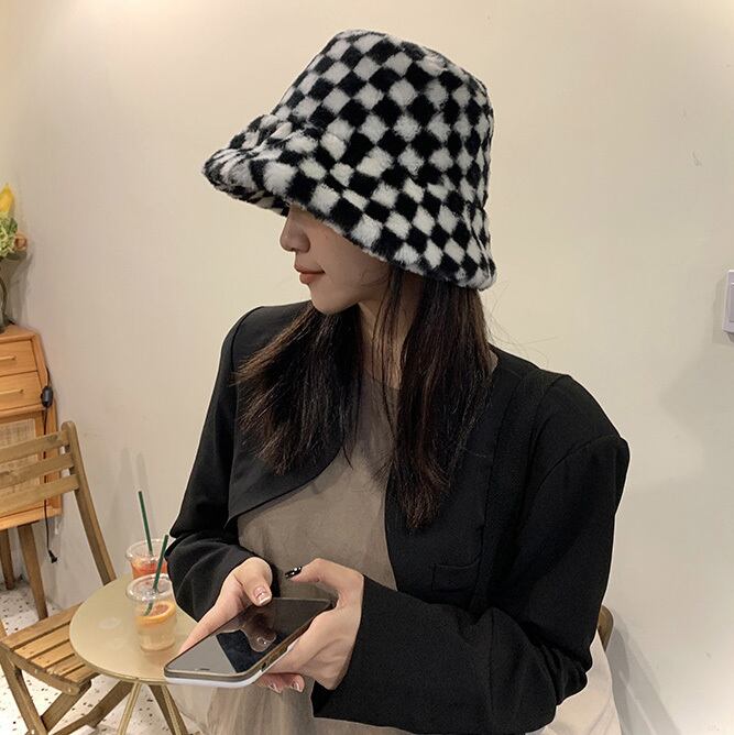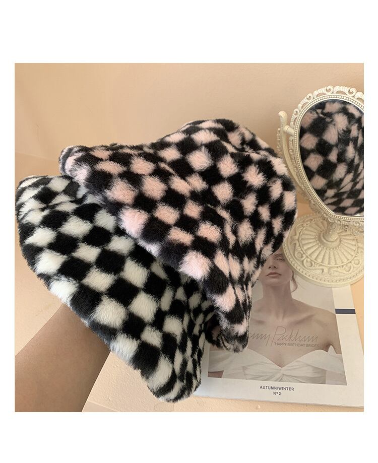 フェイクファーチェッカーハット チェッカーボード ファーハット ハット 帽子 春 秋 冬. a3725
