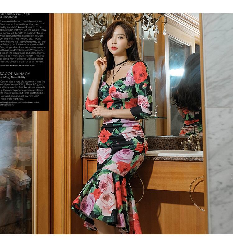 花柄マーメイドワンピース マーメイドドレス 花柄 タイトワンピース フィッシュテールスカート ミモレドレス レディース ナイトドレス パーディードレス セクシー. a3732