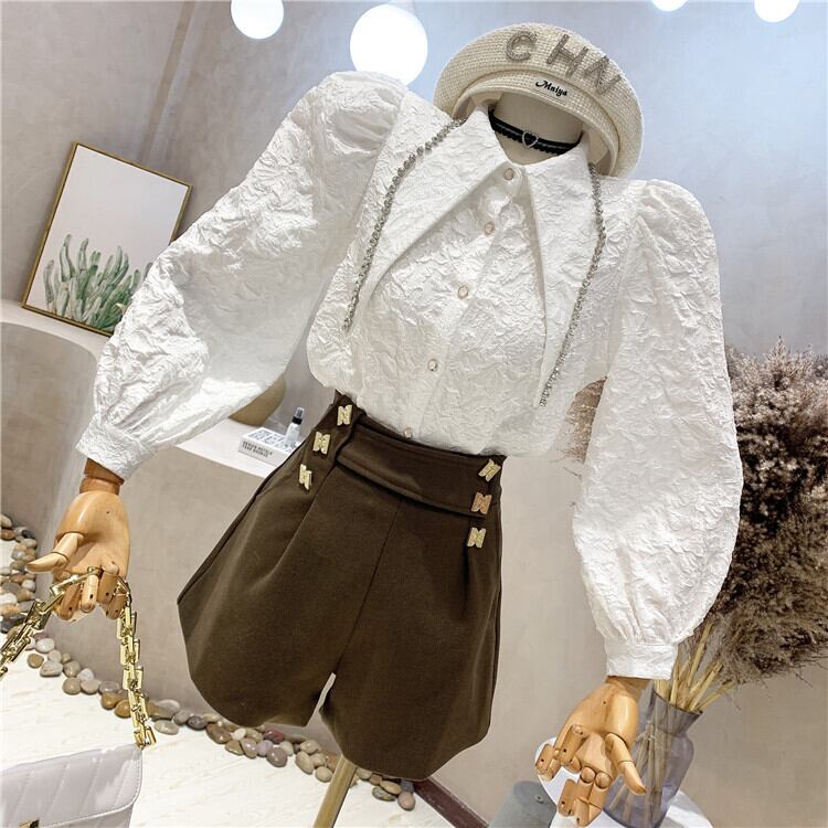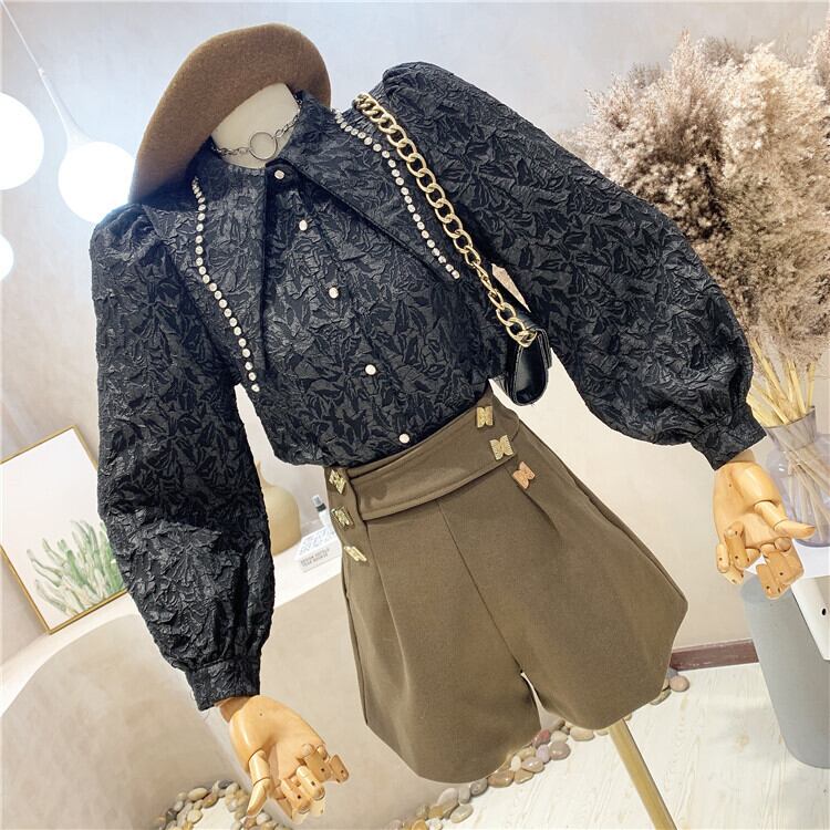 大きな襟にラインストーン装飾がオシャレな長袖ブラウス