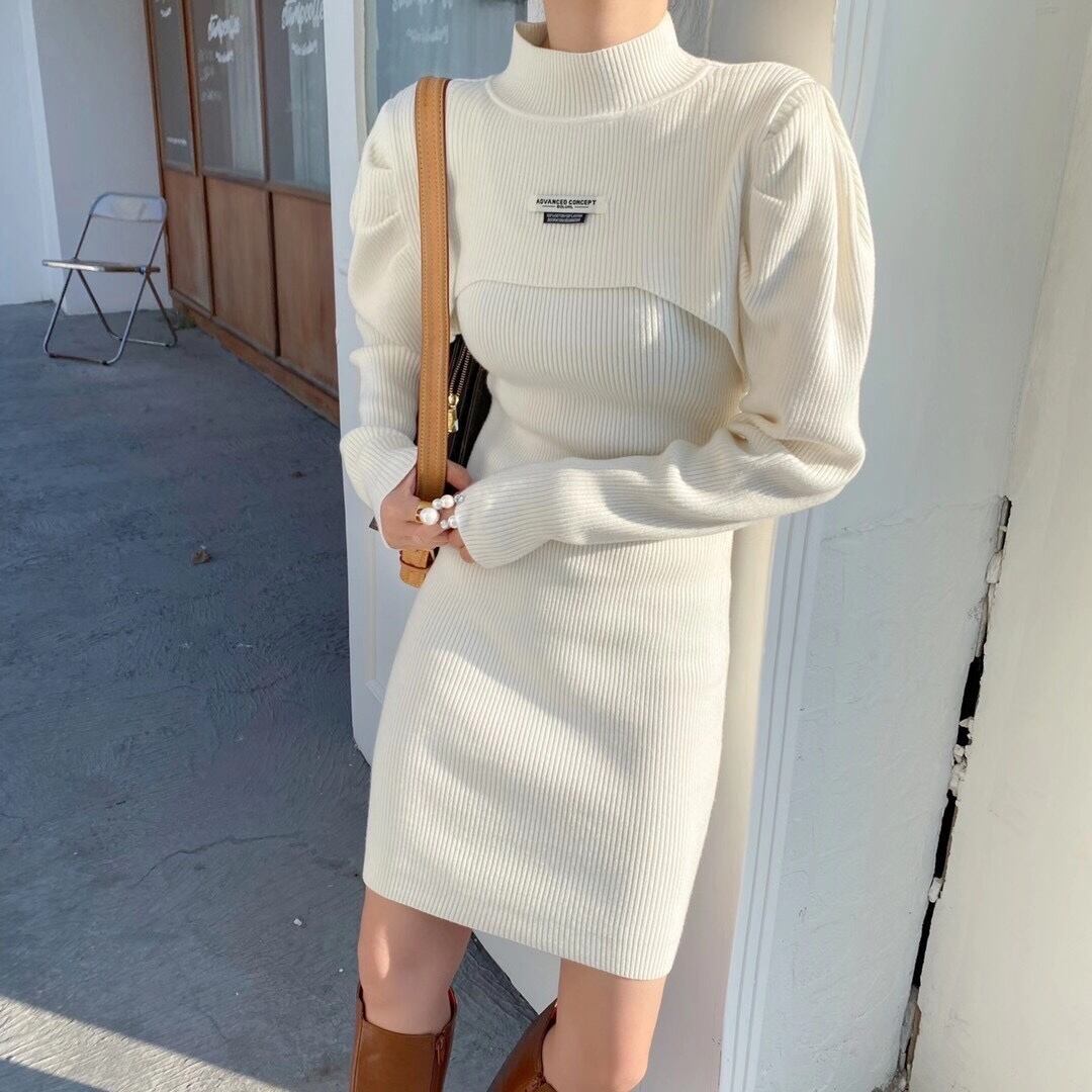 【セット】リブニットワンピース+ショートセーター ワンピース セットアップ ニットアップ レディース 秋冬 ニットツーピース ドレス セクシー 4カラー. a3780