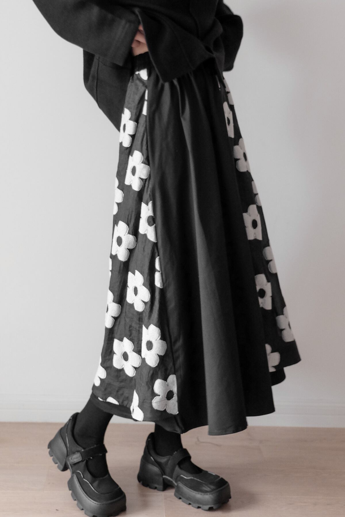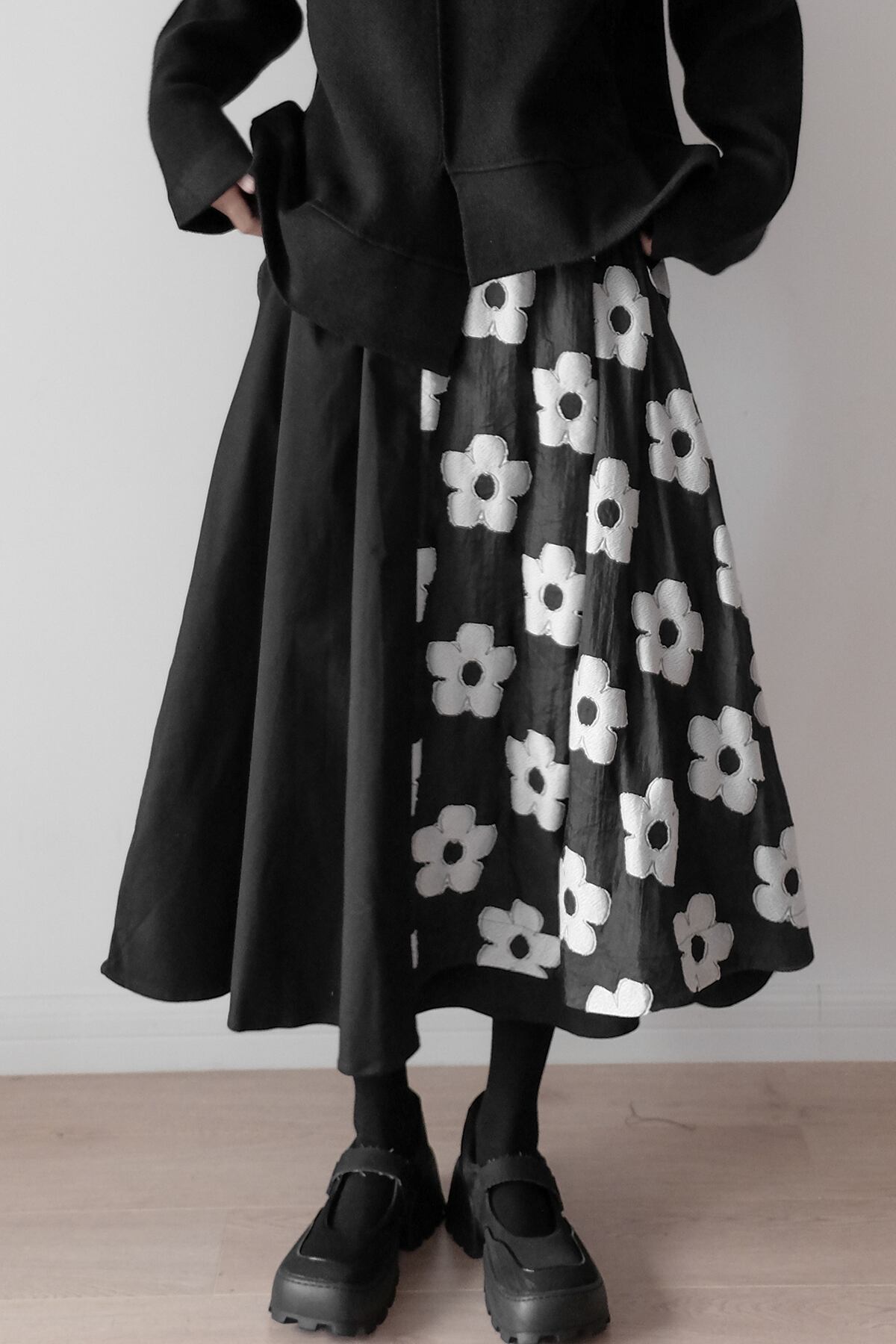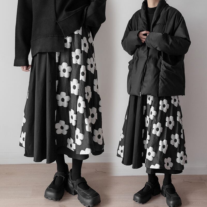 モードっぽさがカッコいい花柄刺繍フレアスカート