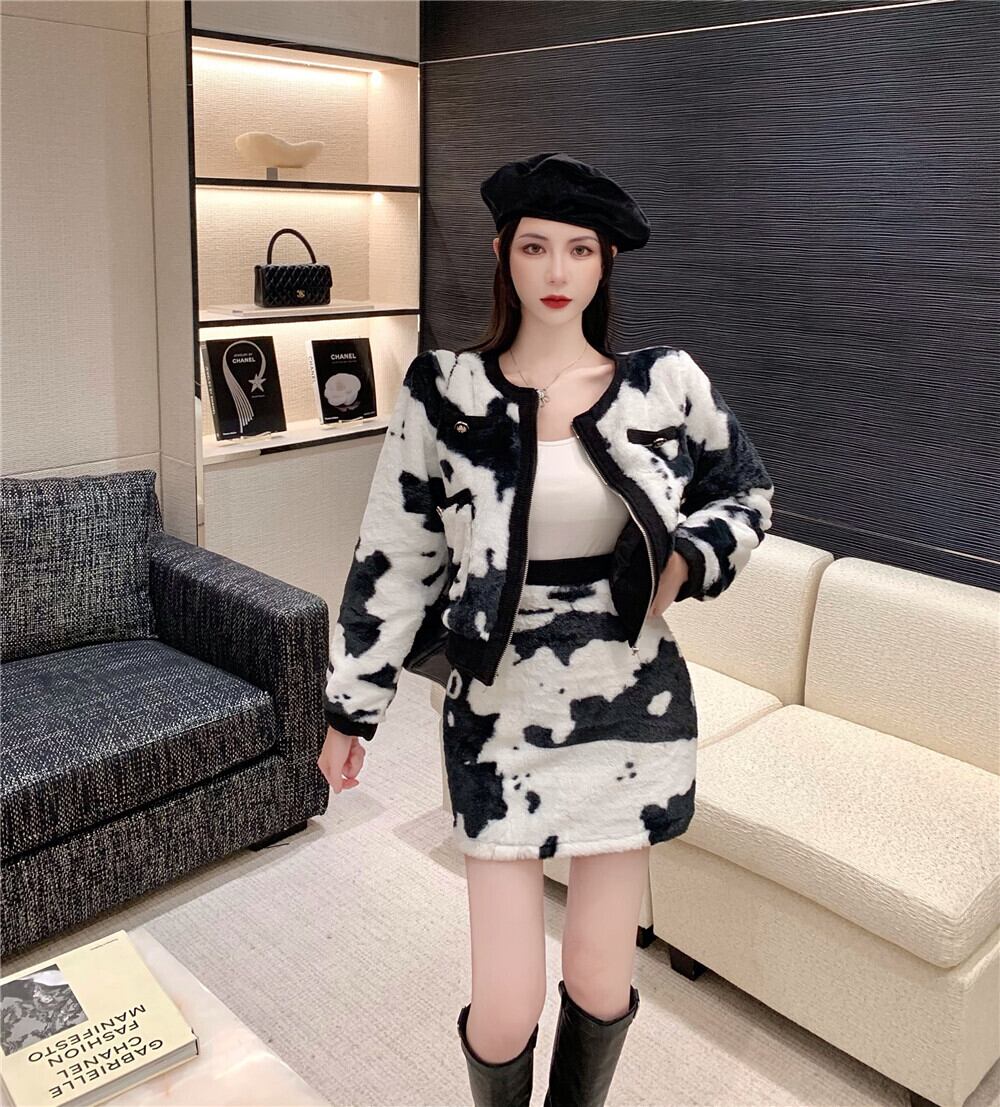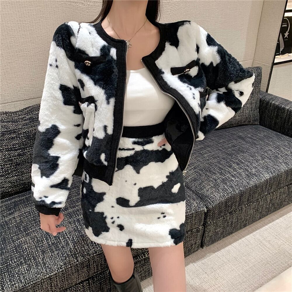 【セットアップ】カウ柄 ジャケット+ハイウエストスカート ツーピース ラウンドネック スリム ミニスカート レディース a3809