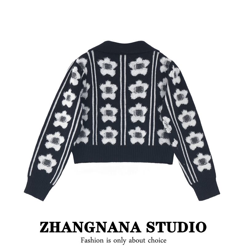 立体フラワーニットセーター ポロシャツ レディース. 秋冬 レトロ ルーズ プルオーバー ポロカラー ショート トップス 韓国 2カラー a3814