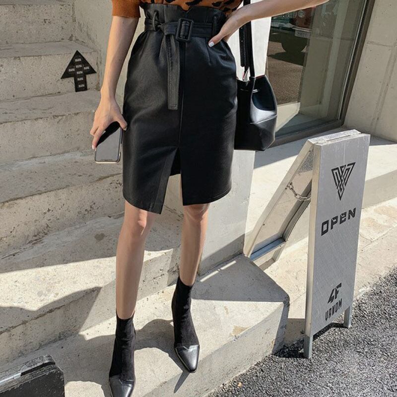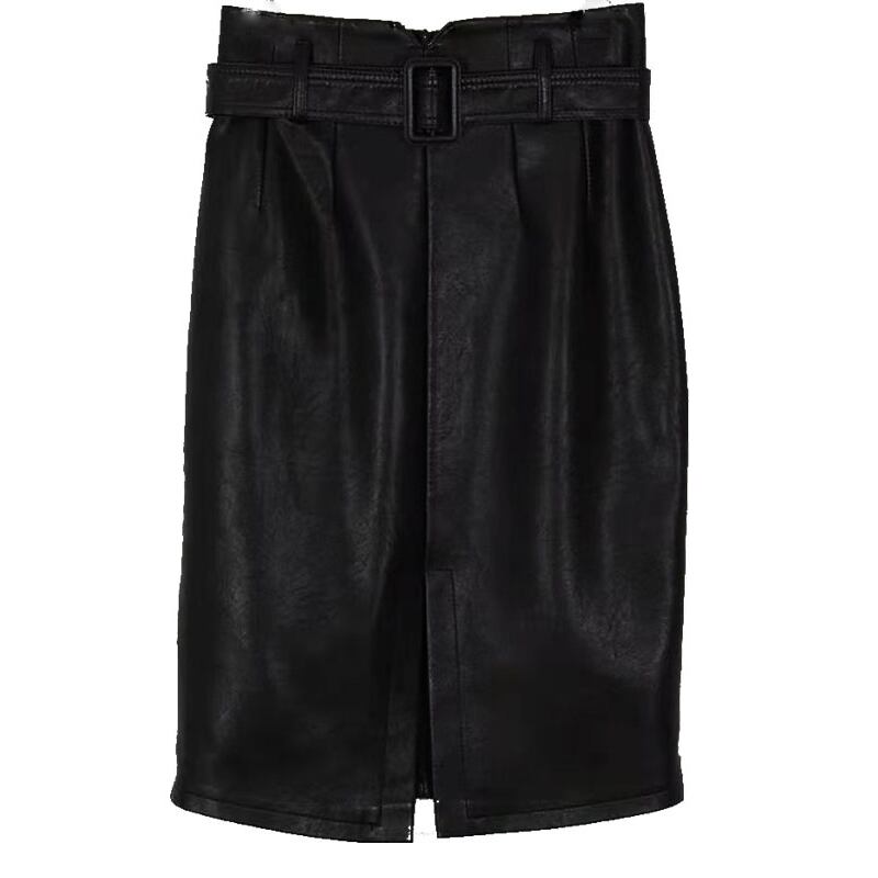 ベルト付き レザースカート スカート ハイウエスト フロントスリット PUレザー ミドルスカート ブラックスカート オフィス お仕事コーデ レディース. a3875