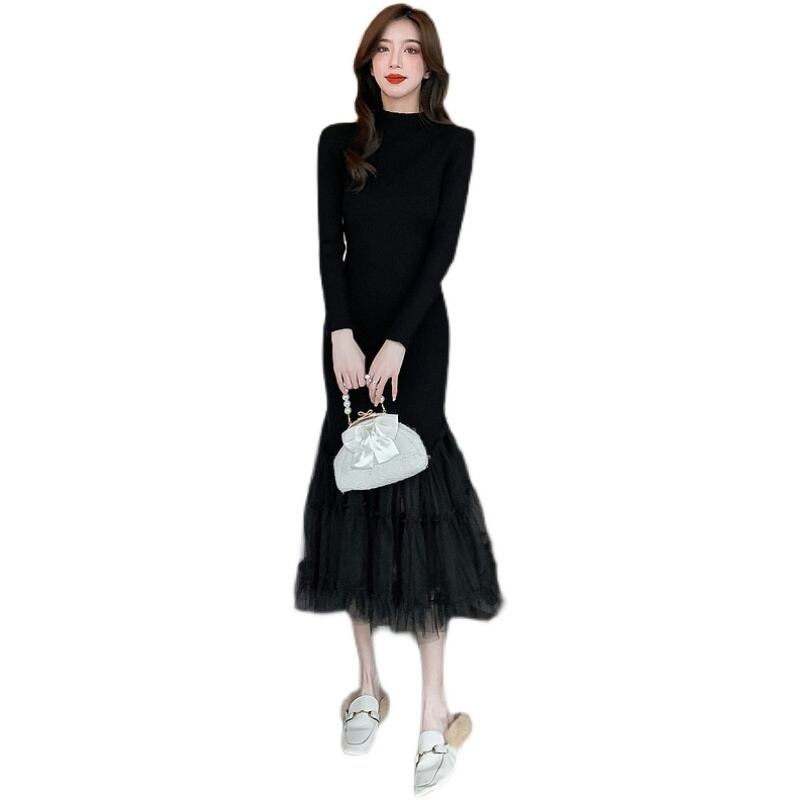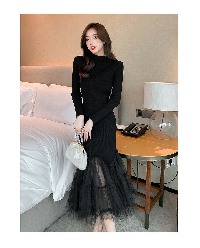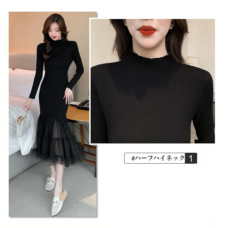 ニットメッシュマーメイドワンピース ニットワンピース メッシュスカート マーメイドスカート ワンピース ニット 異素材 無地 ハイウエスト プルオーバー a3892