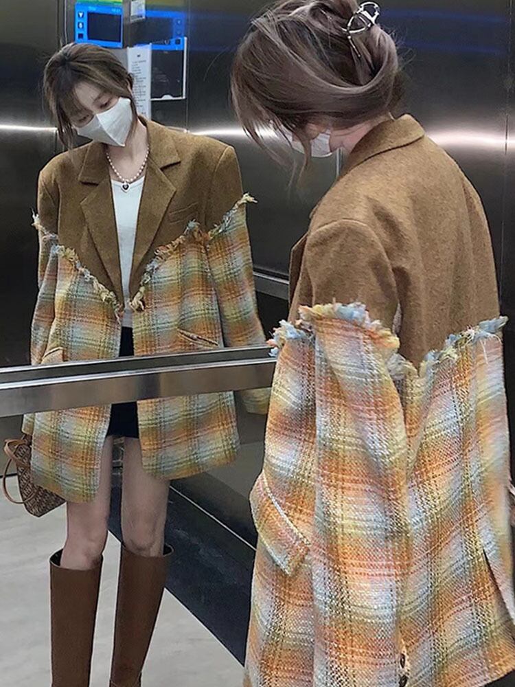 チェック柄 パッチワークジャケット チェック柄ジャケット フリンジ ジャケット スーツ襟 レディース ウールステッチスーツ アメカジコーデ オルチャンコーデ おしゃれ a3897