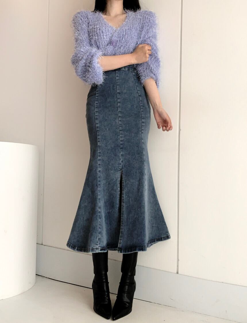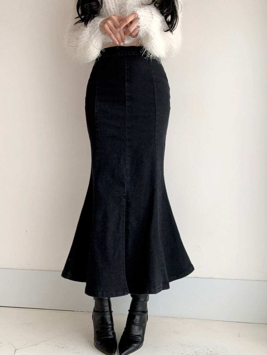 デニムマーメイドスカート ハイウエスト デニム マーメイド スカート フリル フレア ロング スリット 韓国 オルチャン ストリート ギャル 可愛い ジーンズ レディース 2カラー a3903