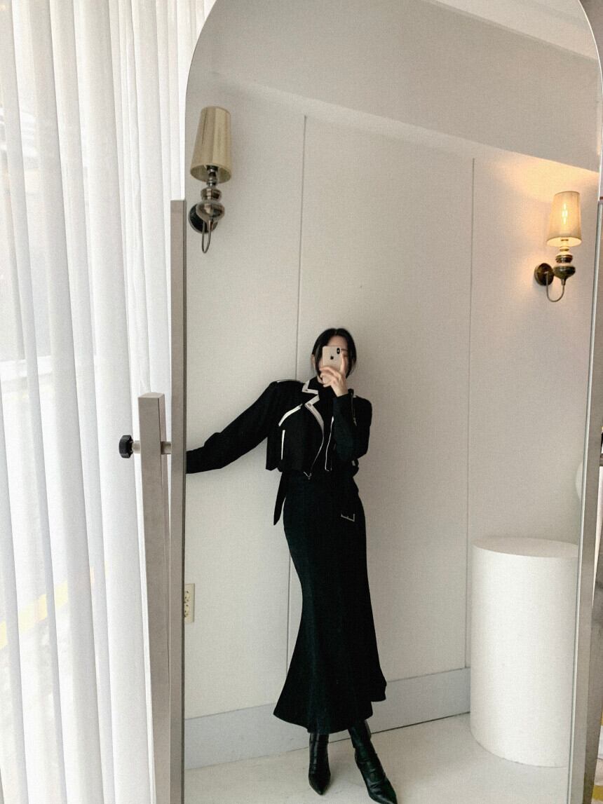スタイルアップさせてくれるマーメイドシルエットに、後ろ姿まで可愛くしてくれるのがポイント。