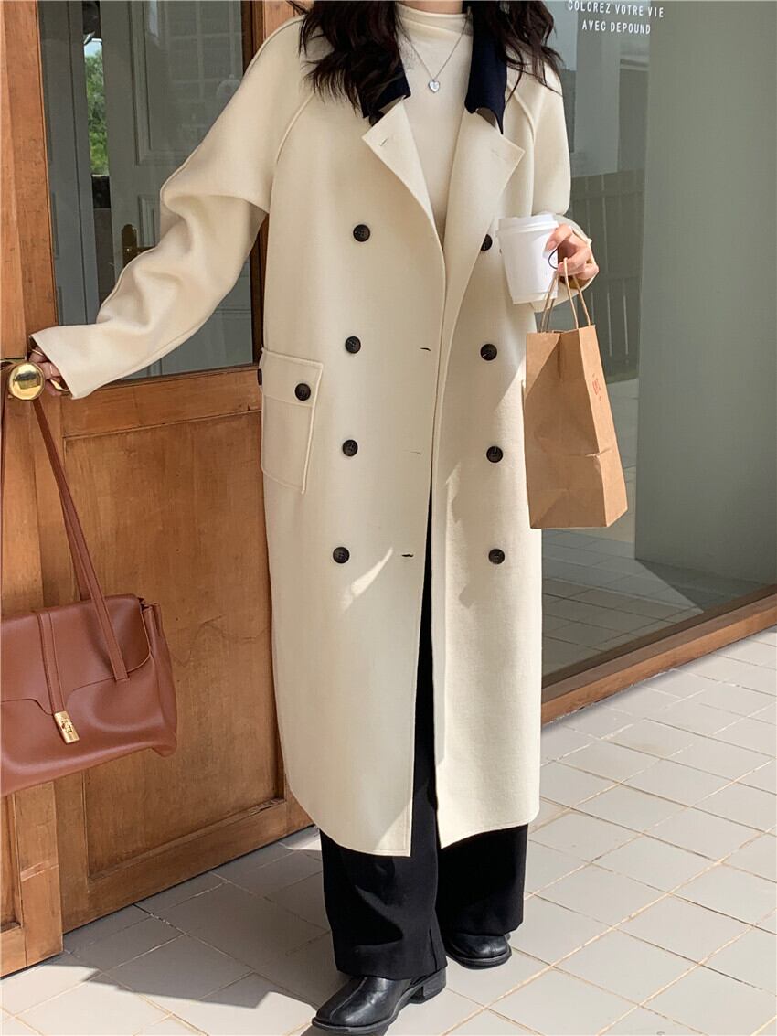 ロングウールコート コントラストカラー ダブルブレスト レディース ミドル丈 カジュアルコート コート ジャケット. アウター チェスターコート 春 秋 冬. オフィス きれいめ カジュアル a3950