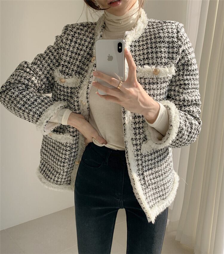 千鳥格子ジャケット 裏ボア ジャケット レディース 入学式 カジュアル 秋 冬 春 ショート丈 フォーマル チェック フリンジ ツイード風 ジャケット ショート丈 ミドル丈 コート 韓国ファッション ブラック ホワイト a3980
