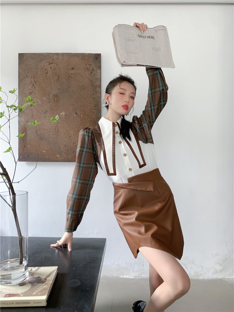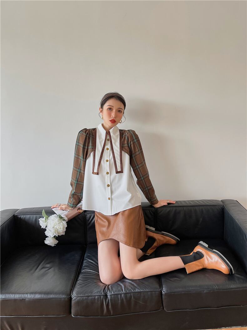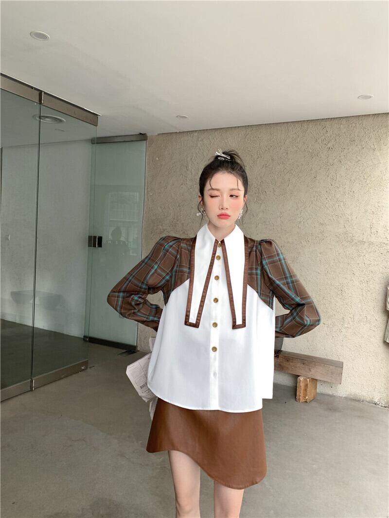 チェック柄カラーシャツ ブラウス 長袖 シャツ 長襟 チェック柄 レトロ 切替 長袖 マニッシュ ショート丈 フロントボタン レディース オフィスコーデ a3966