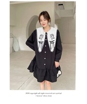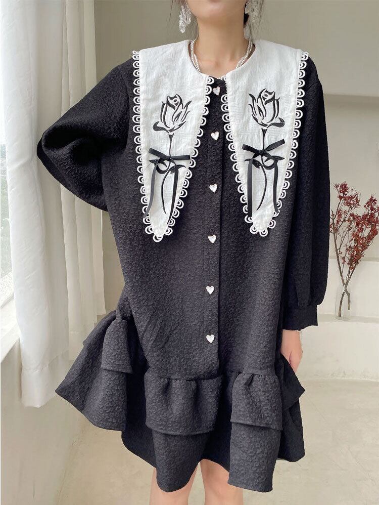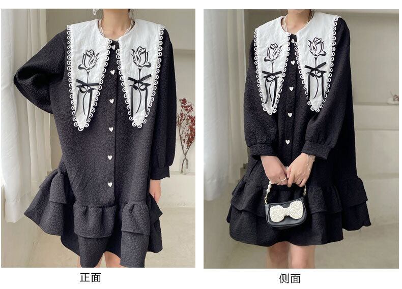 襟部分のバラ刺繍とリボンが魅力的なブラックワンピース