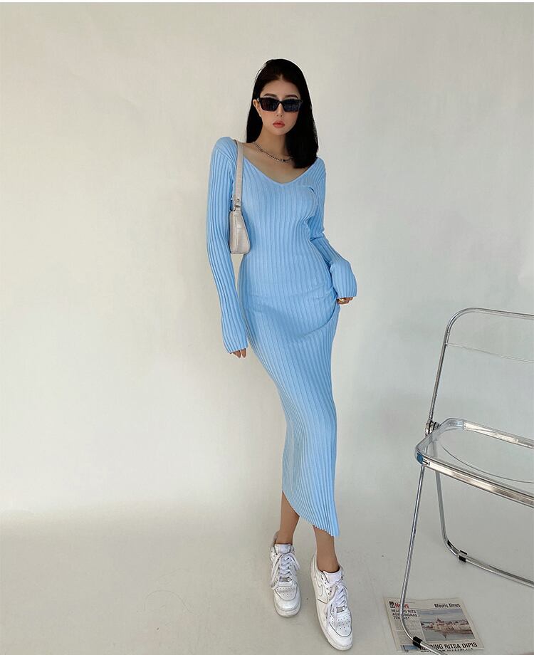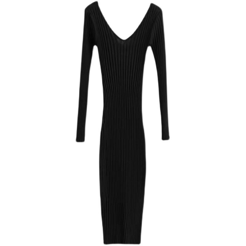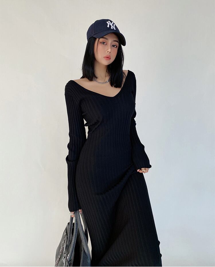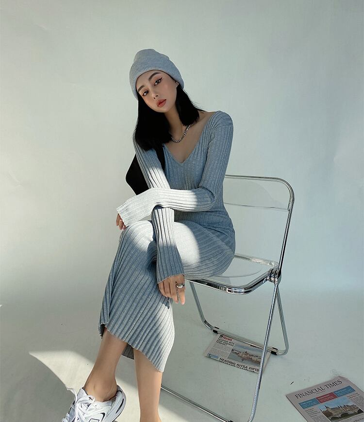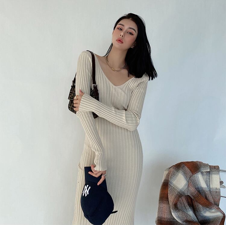 Vネックリブニットワンピース ニットワンピース リブニットワンピース 長袖ワンピース ニット ワンピース ドレス カジュアル ストリート アメカジ レディース ロング丈 4カラー a3977