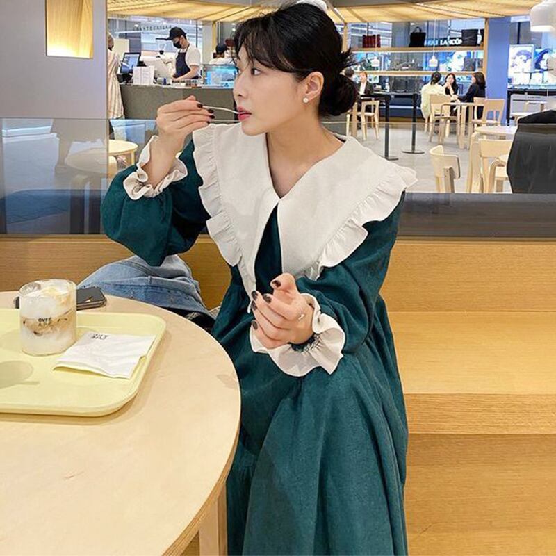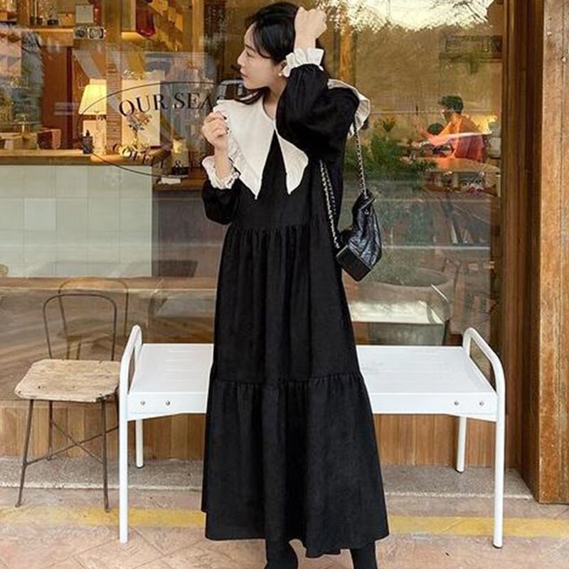 ビッグフリルカラー ロングワンピース フリルワンピース 長袖ワンピース ワンピース ドレス ルーズ パフスリーブ フレンチ レディース 2カラー a3994