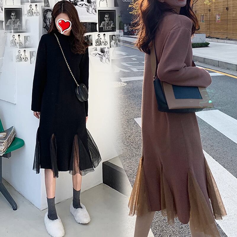 チュール裾ワンピース ニットワンピース 長袖 マーメイドワンピース ルーズ ワンピース ミドル丈 レディース お仕事コーデ ママコーデ マタニティーコーデ 3カラー a4058