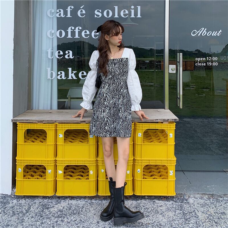 ゼブラ柄ワンピース ドッキングワンピース トレディース ワンピース. ドレス 長袖 春秋 薄手 スクエアカラー かわいい デート オシャレ. a4084