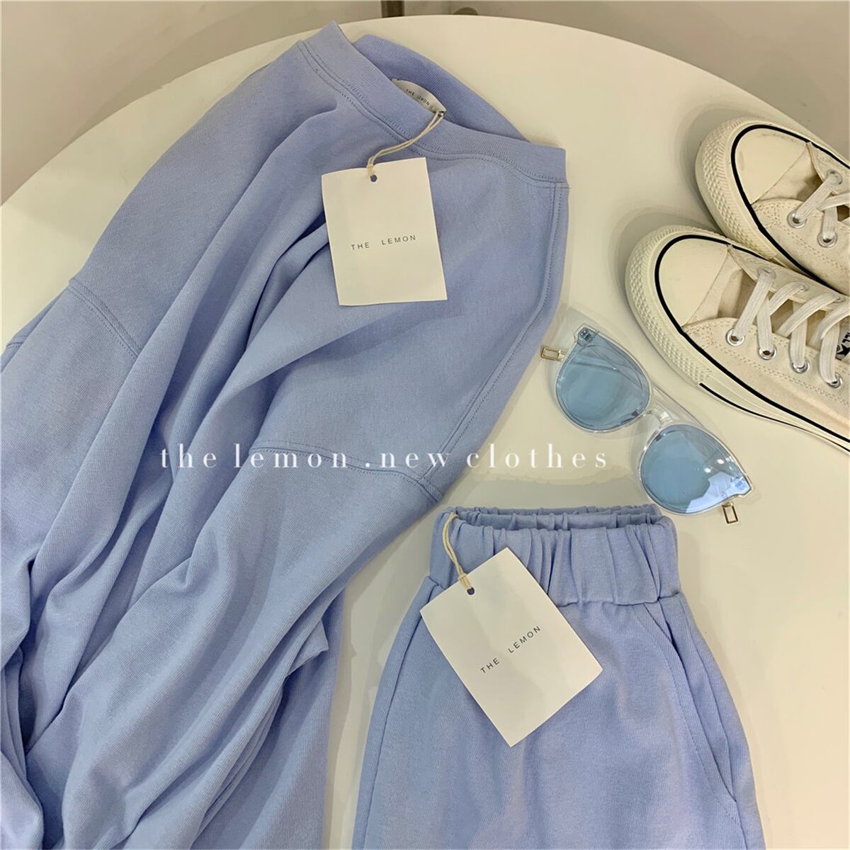 ゆったりとしたシルエットで着心地が良い、同素材のトレーナーとショートパンツのセットアップ