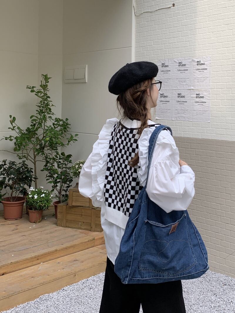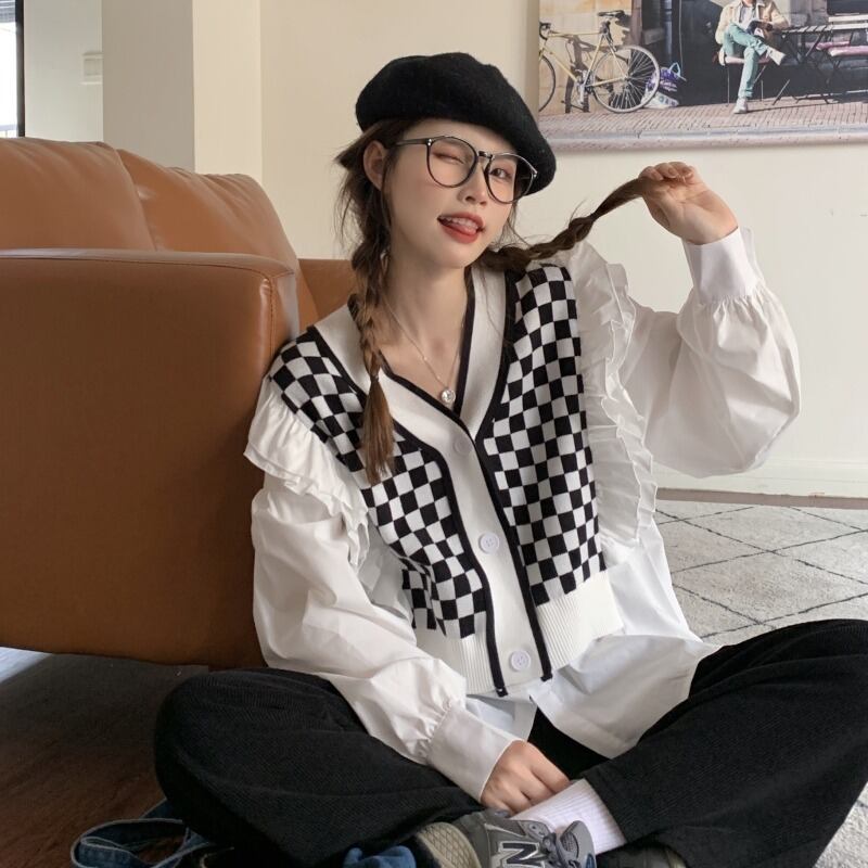 異素材MIXブラウス レイヤード風 チェッカー柄 Vネック フェイクツーピース シャツ フリル ブラウス ベスト 長袖 カジュアル ガーリー 韓国 オルチャン a4092