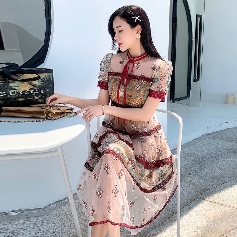 レースフラワー刺繍ワンピース 半袖 ワンピース ドレス 花柄 エレガント パーティー シースルー レース Aライン かわいい 大人可愛い 結婚式 二次会 お呼ばれ a4120