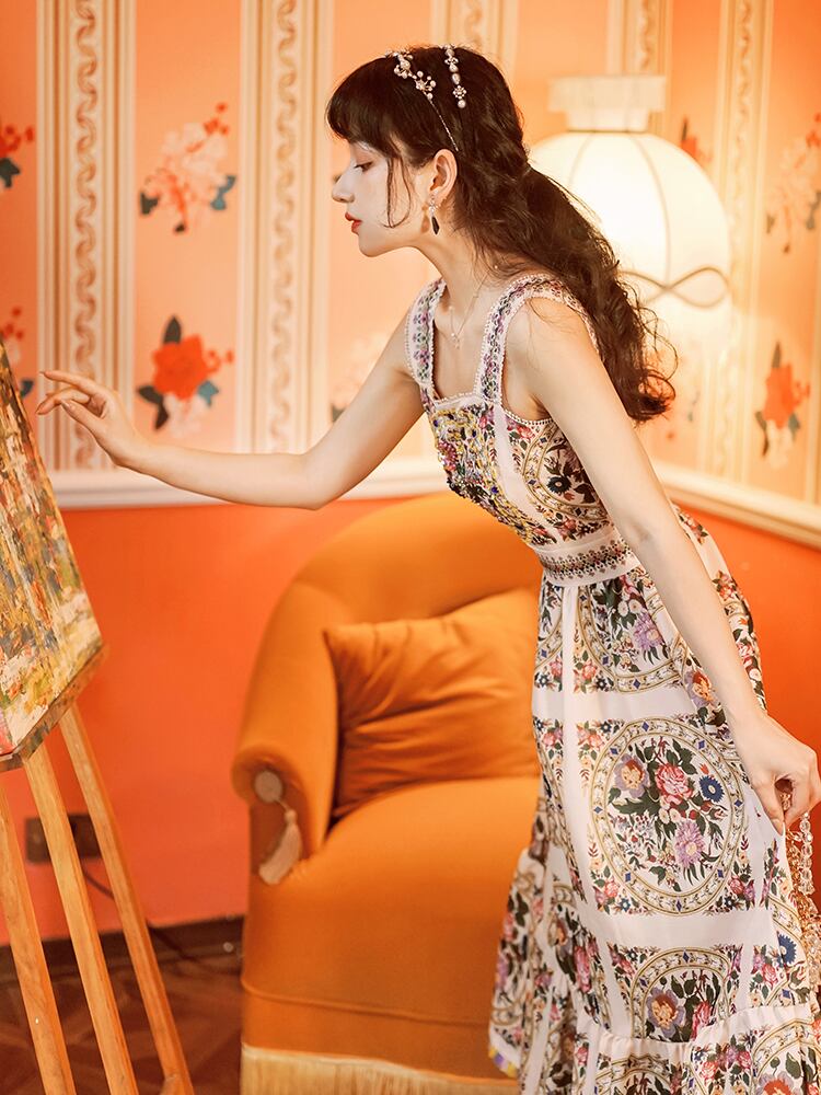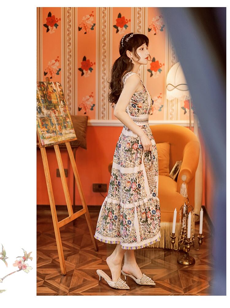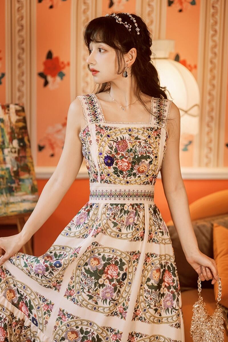 ノースリーブワンピース 花柄 エスニック柄 ワンピース ドレス スパンコール ビーズ ラインストーン フリル キャミソール Aライン ロング ワンピース 大人可愛い 結婚式 二次会 お呼ばれ a4121