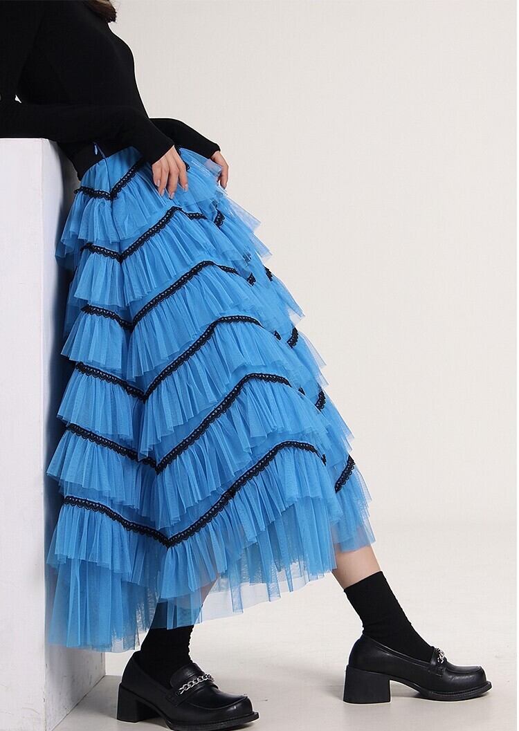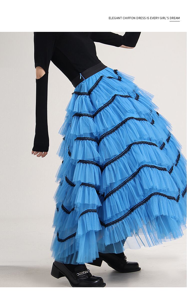 チュールティアードスカート チュチュスカート スカート ハイウエスト メッシュ ロングスカート モード系 レディース オシャレ デート 通勤 オフィス お仕事コーデ ブルー a4125
