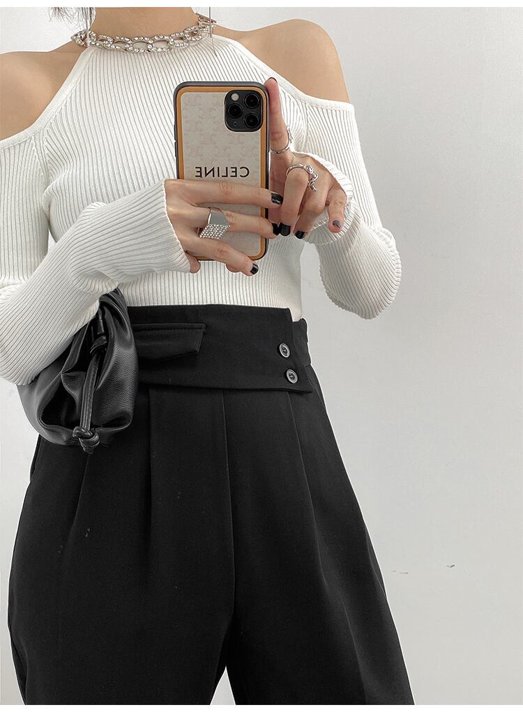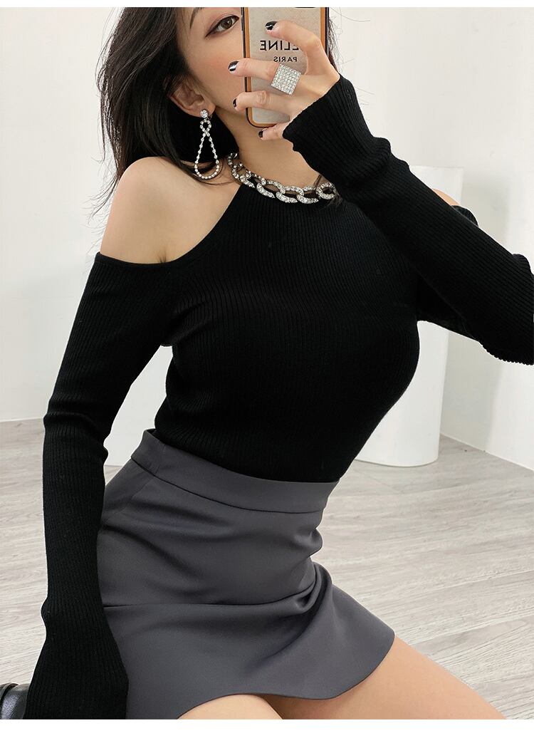 カットアウトチェーンネックリブニット ボトミングトップス リブニット オフショルダー セクシー 長袖 セーター レディース アメカジ 海外ガール 2カラー a4127