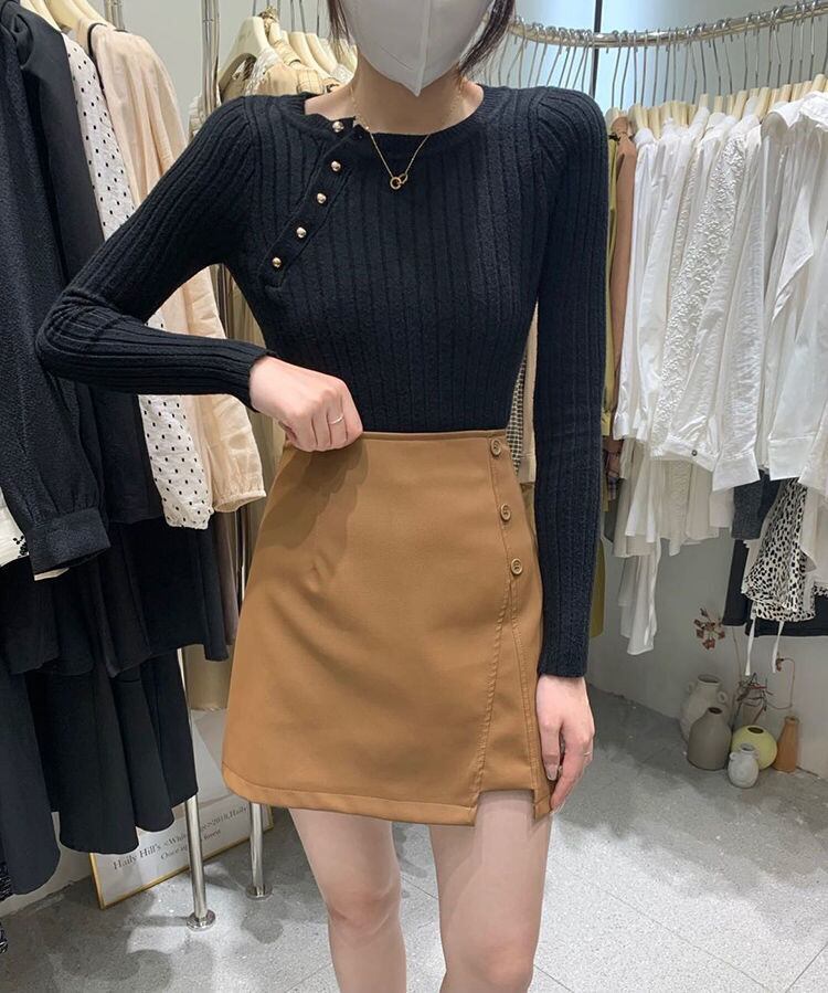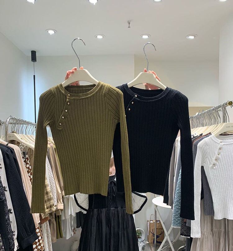斜めボタン付き リブニット 長袖 ボトミングシャツ トップス シンプル ストリート オシャレ ボタン 無地 ニット セーター 4カラー a4139
