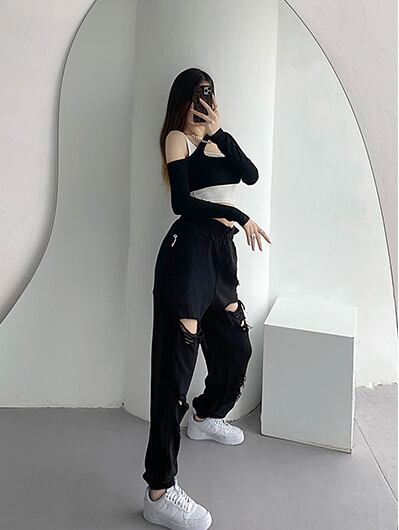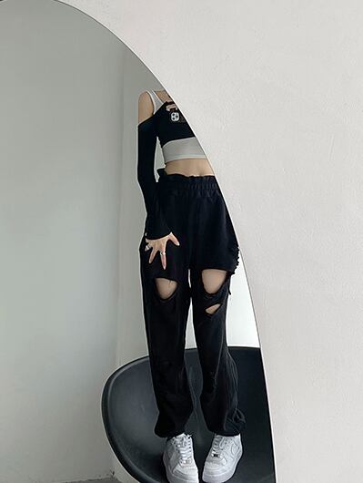 ダメージブラックパンツ カジュアルパンツ スウェットパンツ ルーズ ストレート ハイウエスト ストリート ヒップホップ ダンスパンツ アメカジ カジュアル a4144