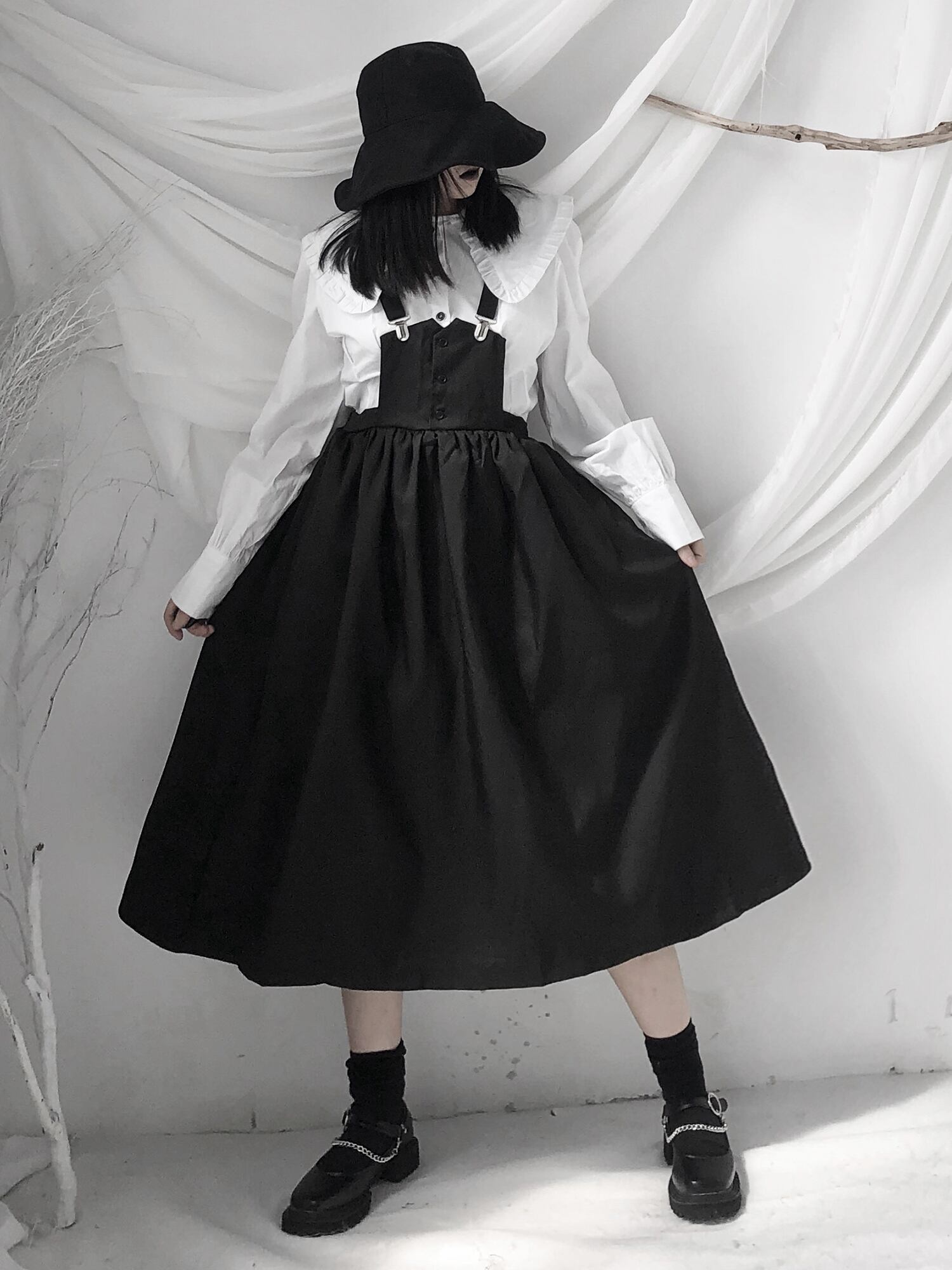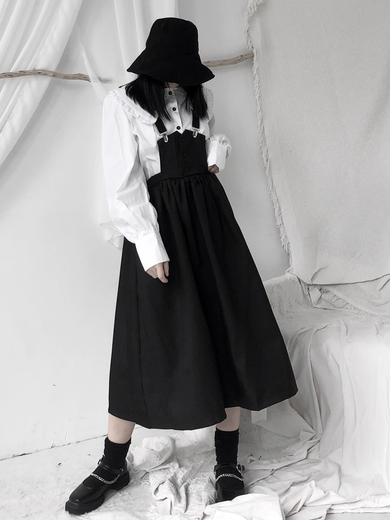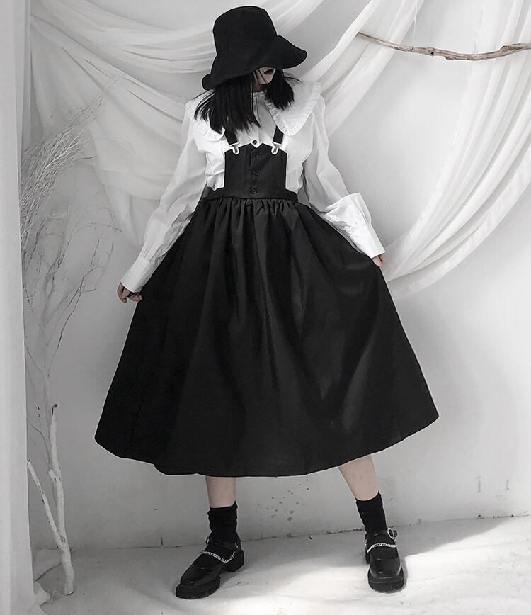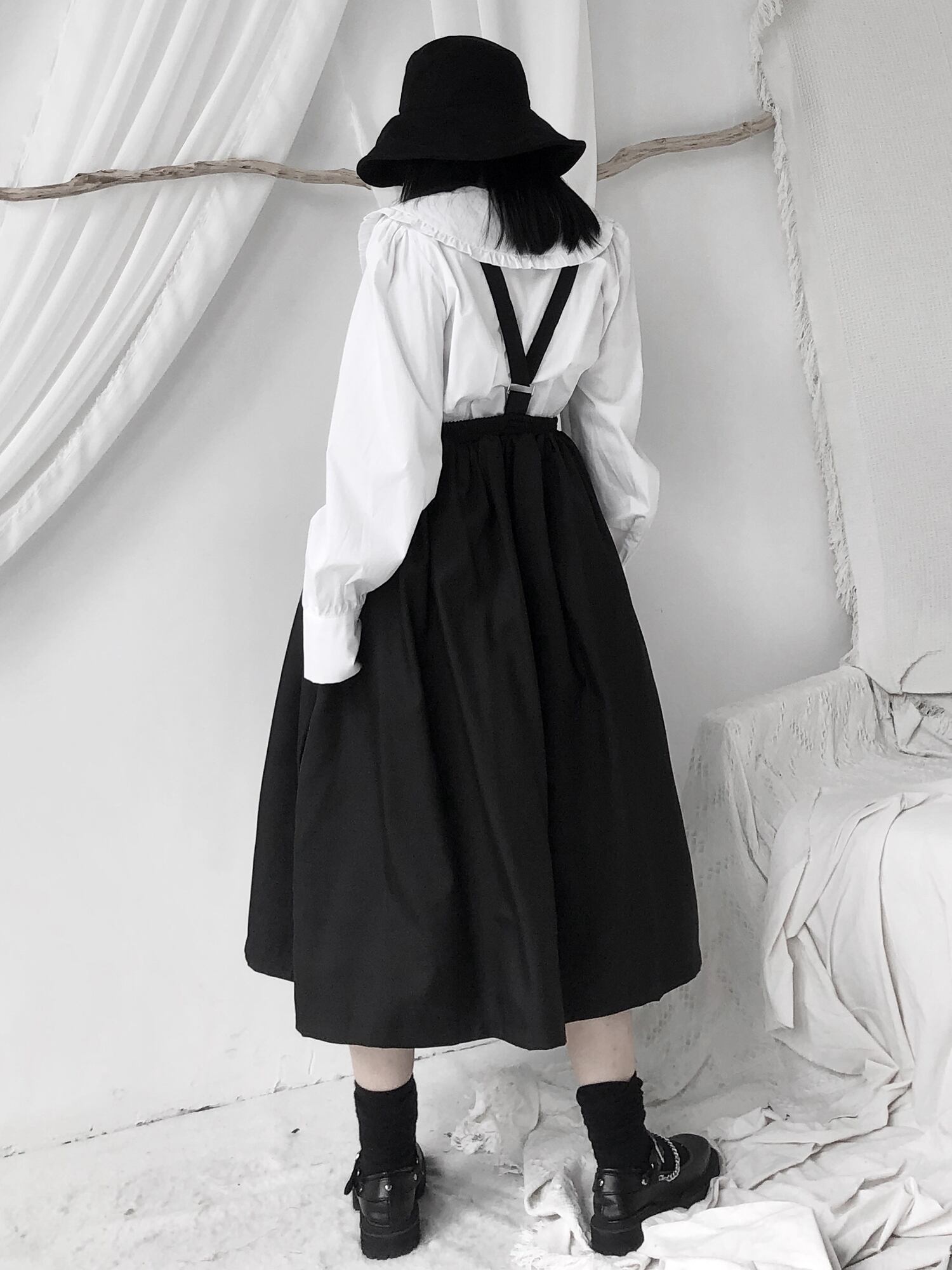 サスペンダースカート ブラック スカート ストラップスカート Aラインスカート ミドル丈 モード系 ブラックコーデ 原宿系 a4153