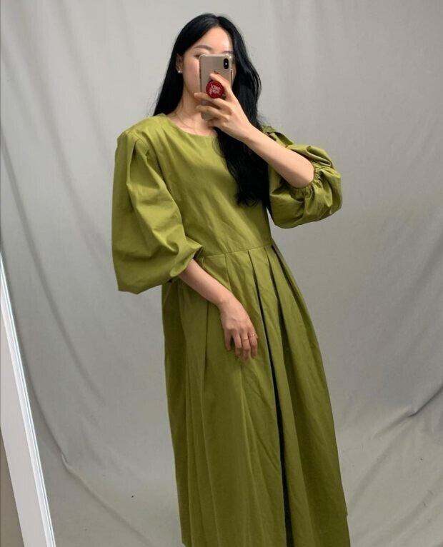 バルーンスリーブ プリーツワンピース パフスリーブ ワンピース ロングワンピース ドレス ワンピース ラウンドネック プリーツ ルーズ レディース 2カラー a4182