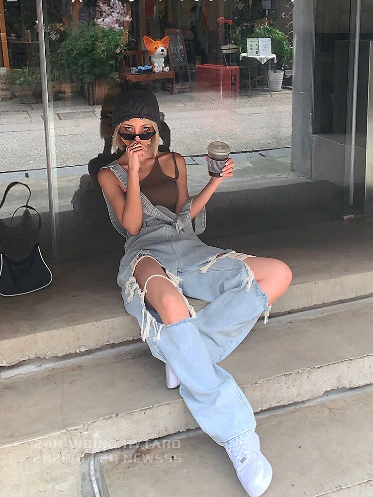 ダメージデニムオーバーオール オールインワン デニムオーバーオール レディース オーバーオール ルーズ ハイウエスト カジュアル ストリート アメカジ オシャレ a4271